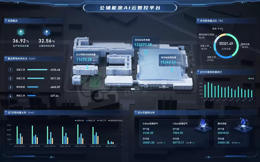 在实践应用过程中,AI云智控系统能够精准采集设备运行数据,建立数据模型,系统及时地根据生产用能需求调整能源供给,实时智能控制能源供给侧设备运行,确保设备处于最佳运行状态。在保障安全供能的前提下,实现工厂能耗下降超15%,累计减少约885吨二氧化碳排放,让其成长为行业零碳排放的门面担当。