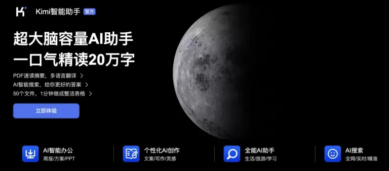 月之暗面Kimi 致力于探索将能源转化为智能的最优解,目标是通过生产能够传播知识、解答疑难、解决复杂问题的智能,赋能每个人成为“超级人类”。2023 年 10 月,月之暗面推出了超大脑容量的AI助手产品——Kimi 智能助手,支持 20 万汉字输入。