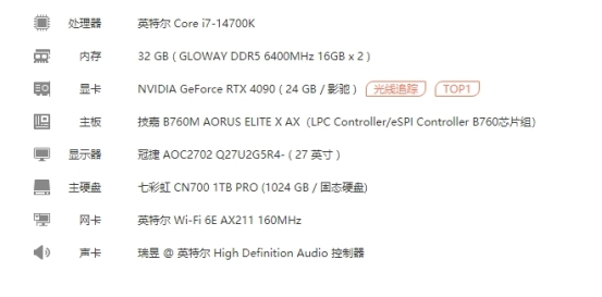 CPU使用了最新14代酷睿i7-14700K,搭配最新B760M主板,显卡则是RTX 4090。朗科NV7000-t 1TB PCIe4.0 SSD作为从盘进行测试。