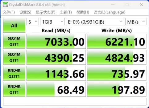 默认设置下,朗科NV7000-t 1TB PCIe4.0 SSD持续读取速度达到7033MB/s,写入速度达到6221 MB/s,4K QD1随机读写速度分别达到68/197MB/s,这样的理论性能表现,处于一线PCIe 4.0 SSD性能水准。可见换主控之后,性能表现非常给力。