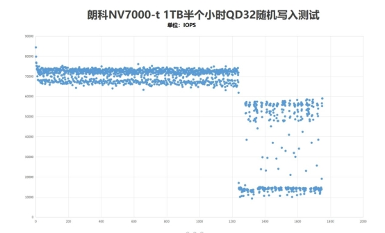 在4K QD32随机写入,连续半个小时的情况下,测试出来的数值分布是比较密集的,说明在高强度写入时,朗科NV7000-t 1TB有着不错的稳定性和一致性。