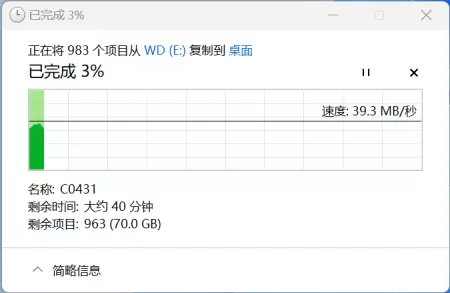 这是什么概念呢?我用机械式移动硬盘读写这个文件时,写入速度大约只有40MB/s,完成需要40分钟。对比朗科NV7000-t 1TB PCIe4.0 SSD超快读写速度,简直一个天上一个地下。