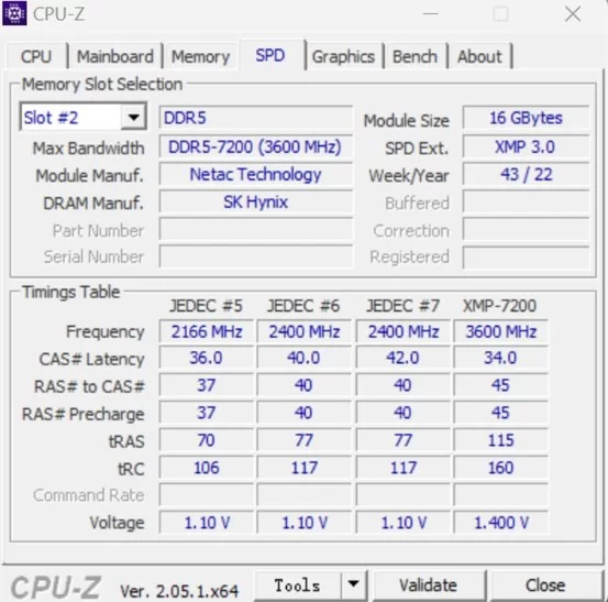 来看CPU-Z的SPD截图,内置一档XMP-7200参数。开启之后,内存自动工作在7200MHz频率,CL34-45-45-115的时序,电压1.4V下。