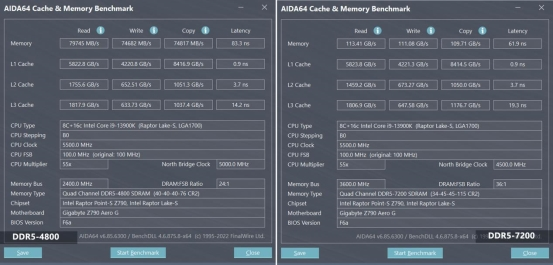 在AIDA64测试中,朗科Z系列RGB DDR5-7200内存的读取/写入/复制速度比起DDR5-4800的,有巨大的提升,已经飙到100GB/s以上。再看延迟表现,在高频低时序加持下,延迟也降下来,从83.3ns降至61.9ns,对于延迟敏感的应用和游戏,无疑是大大的利好。