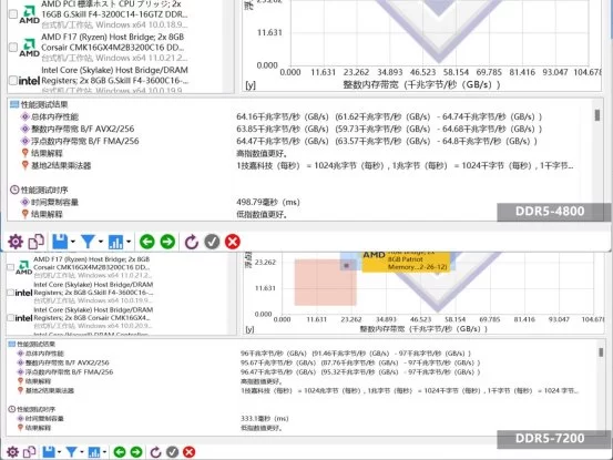 DDR5-4800频率跑出的带宽仅64.16GB/s,而在7200MHz高频下,带宽飙到96GB/s,提升幅度达到33%,这就是高频的内存实力。