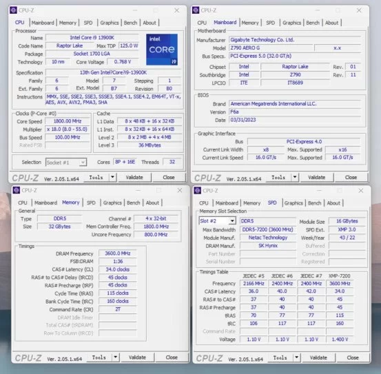 作为一款高频内存,需要匹配高端硬件平台。CPU选择的是i9-13900K,13代酷睿的旗舰,搭配一张高端的Z790主板,能够更好发挥朗科Z系列RGB DDR5-7200 16GBx2套装的性能。