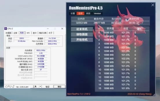 经过我们一番探索,在现有平台的基础上,最终将内存频率超至8000MHz,此时内存的电压略升高至1.50V,时序调整为40-46-46-128,顺利完成RunMemtestPro 4.5烧机测试,100%无错误。