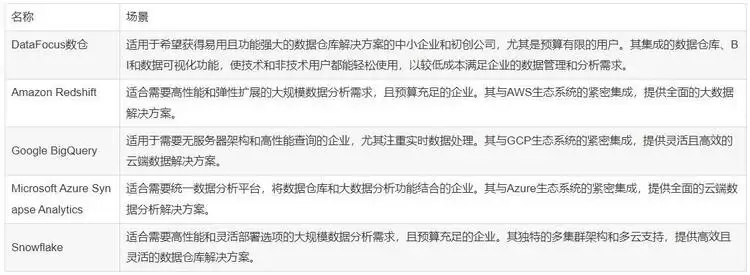 以零售行业为例,许多零售企业使用数据仓库来整合销售、库存和客户数据。通过数据仓库,企业能够获得全面的业务视图,进行深度的销售分析和库存优化。例如,沃尔玛利用数据仓库分析销售数据和客户行为,优化库存管理和供应链策略,从而提高了运营效率和客户满意度。还有其他比较常见的数据仓库,比如:DataFocus数仓、 Amazon Redshift、Google BigQuery、Microsoft Azure Synapse Analytics、Snowflake。
