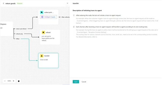 例如,我们在呼叫中心的IVR中接入了AI Agent的接口,在任一节点都支持一键添加大模型机器人,当用户电话进线后,AI Agent会根据用户问题或回复进行灵活语音应答,相比传统呼入机器人灵活性更高,更趋向于真人交互体验。
