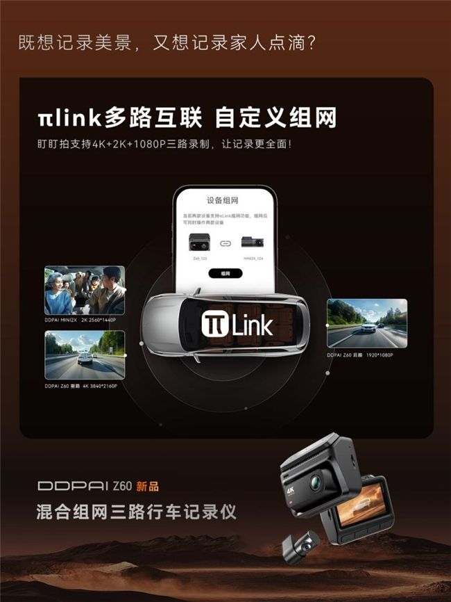 Z60的最大亮点在于其内置的盯盯拍自研πLink无线组网技术,在这项技术的支持下,Z60不仅支持标准4K UHD超高清前录与1080P高清后录,更突破性地实现了与盯盯拍2K数字高清记录仪MINI2X的无线混合组网,轻松将两路影像扩展至三路,前方路况的清晰捕捉、后方车辆的实时监控、乃至车内任意位置的灵活布控,Z60都游刃有余,为车主提供全方位、多角度的行车视野。