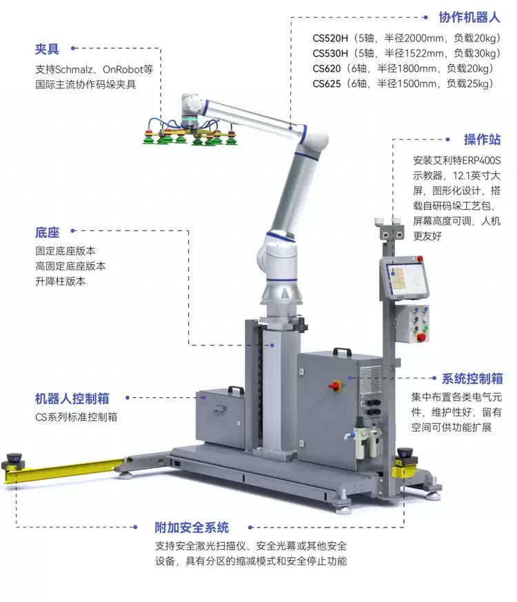 一键部署解决多种码垛难题的大力“码”手震撼亮相!艾利特全球首发新品——CP系列模块化协作码垛机,具有多种组合配置,可通过升降柱、机器人的不同搭配,应对客户多种类型箱子、托盘和堆放高度需求。向导式工艺流程配置,免编程,轻松上手。更支持国际主流协作码垛夹具、码垛样式支持自动排样、手动排样、外部导入排样、垛形整齐度自动调整等。有效解决汽车及汽车零部件、3C电子、食品饮料、电商仓储、新能源、日化包装、印刷、快递物流等行业码垛痛点。