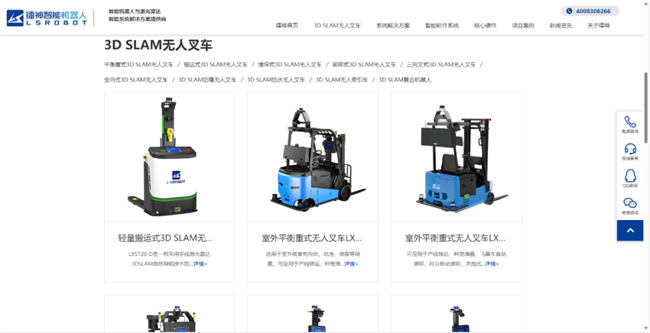 官网精心设计了3D SLAM无人叉车系列产品矩阵展示区,从轻量搬运式到前移式,再到室外平衡重式无人叉车,全方位覆盖不同行业、不同场景的需求。