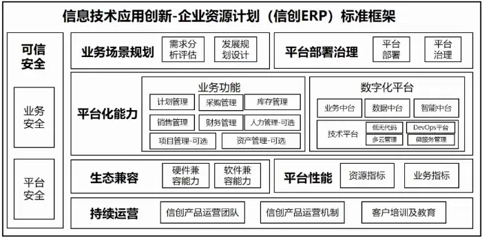 该标准的评估涵盖前期咨询规划、中期平台建设及后期持续运营三大阶段;重点提出业务场景规划、平台部署治理、平台化能力、平台性能、生态兼容、持续运营、可信安全等7大指标;并重点考察信创ERP所需的计划管理、采购管理、销售管理、库存管理、人力管理、财务管理、项目管理等场景化能力;此外,还评估数字技术应用、系统集成、软硬件生态兼容等能力。
