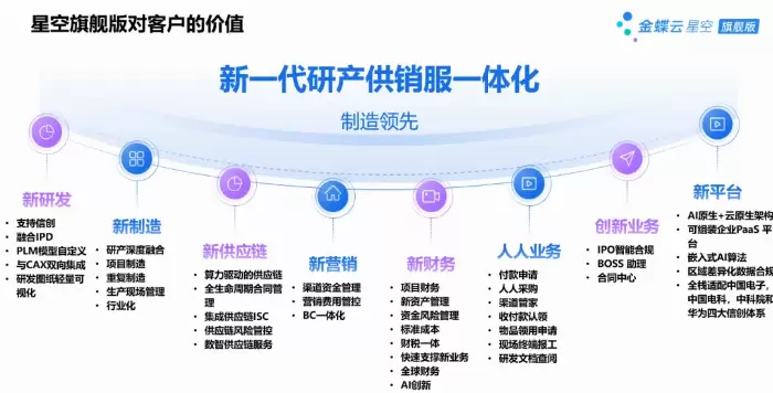 它打造了财务云、制造云、供应链云、质量云、PLM云、条码云、营销云、供应商协同云、人人业务云、员工服务云、协同云、数据智能云、项目云、税务云、银企云、行业云、发票云及人力云等涵盖18大核心领域的云服务矩阵。这些服务全方位助力企业构建数字化与智能化的核心驱动力。