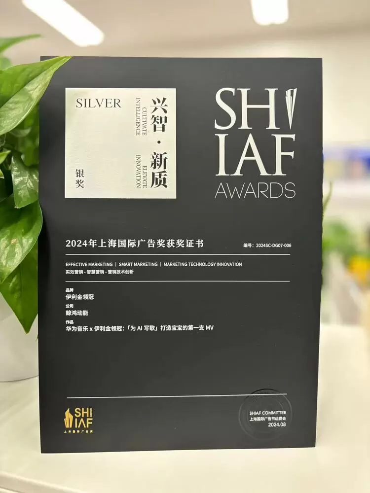 上海国际广告节,作为全球广告创意领域的年度盛事,汇聚了来自国内外的优秀创意人才和品牌。在今年的颁奖典礼上,鲸鸿动能联合伊利金领冠,通过华为音乐共创的“「为AI写歌」打造宝宝的第一支MV”,从1321件广告创意作品中脱颖而出,获得银奖。