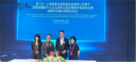 随后,海智在线与西门子举行了签约仪式。双方基于西碳迹赋能中小企业绿色出海及零部件低碳供应链战略合作备忘录进行了签约。这标志着未来海智在线将与西门子一同,帮助中小企业解决在出海贸易中遭遇的绿色化门槛,为中国工厂创造更大价值,积极推动中国产业链供应链绿色化转型和可持续发展。
