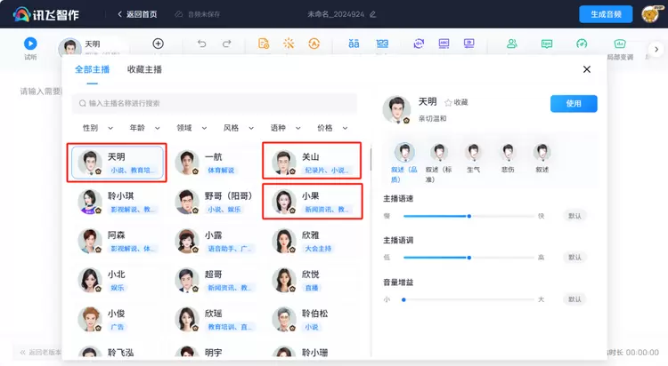 想象一下,当新闻不再只是文字的堆砌,而是由讯飞智作的天明、小果、关山三大特色声音娓娓道来——天明的清晰专业,如同晨光初照,温暖而有力;小果的亲切自然,就像老友在耳边低语,拉近了资讯与你的距离;关山的沉稳磁性,则为财经评论披上了一层智者的光辉,让人在思考中收获洞见。这不仅仅是信息的传递,更是一场情感的共鸣,让新闻播报焕发出前所未有的生命力。