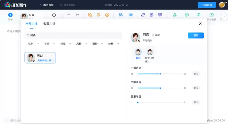 在讯飞智作上,阿森以其独特的嗓音为影视解说场景注入无限活力。其声音沉稳而富有感染力,能够精准捕捉影片精髓,无论是悬疑片的紧张氛围,还是动作片的激烈对决,高度的情感共鸣与场景代入感,让每一次解说都成为观众与影片之间的桥梁。