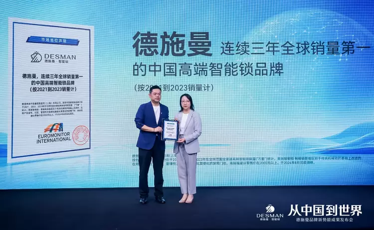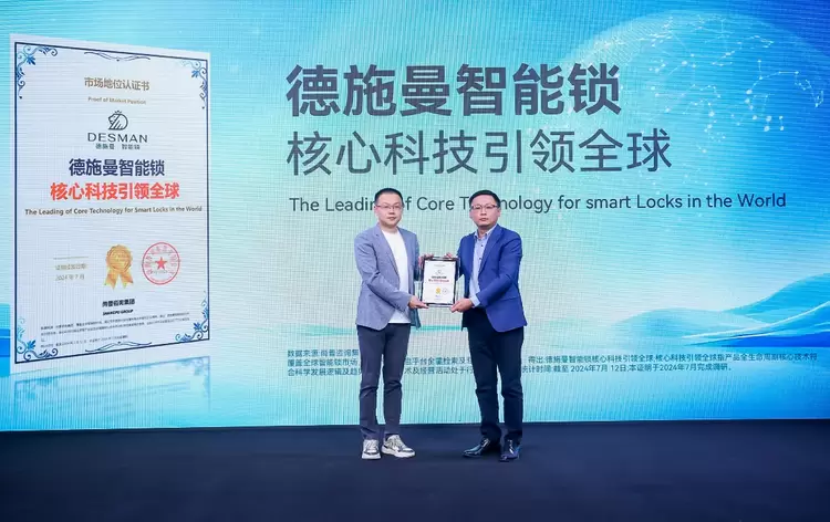 9月25日,德施曼品牌新势能成果发布会在京举行。会上,国家科委批准成立的中国日用五金技术开发中心(以下简称“日用五金”)、国际权威咨询公司欧睿信息咨询公司(以下简称“欧睿”)、尚普咨询集团(以下简称“尚普”)共同发布了德施曼高端智能锁“连续三年全国销量第一、全球销量第一”认证以及“核心科技引领全球”认证。