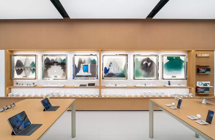 首先在店面的设计上,旗舰店依旧遵循着“以人为本”的理念,重心从产品展示转向消费者的体验。每一个细节都经过仔细考虑,无论是产品展示区、游戏手办区、小O学堂,还是影像展示区,都巧妙地融入了贵州的传统文化元素。例如,“小O学堂”的整体设计灵感就源自于贵州的梯田;IoT产品展示区中的OPPO Watch也被巧妙地排列成小七孔拱桥的模样,OPPO Pad则组成了黄果树瀑布的壮观景象。