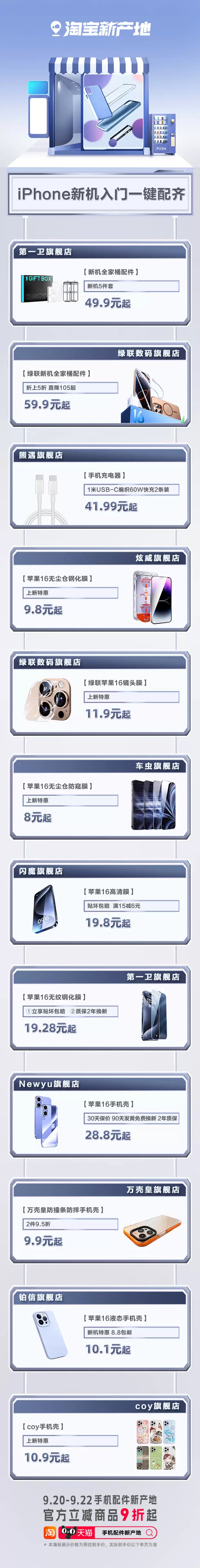 此次,淘宝新产地联合了众多深圳产业带商家,推出多个品类的数码配件,覆盖手机壳、数据线、手机充电器、充电宝等,并设有专供iPhone 16系列的配件专区,以“9.9元包邮”的形式吸引消费者。