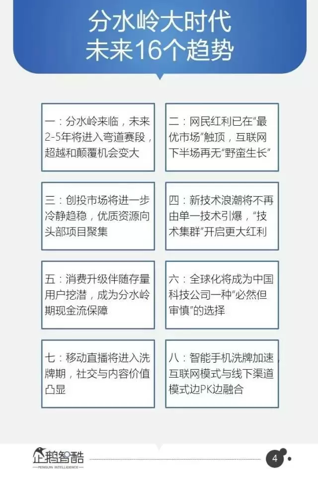 仔细阅读报告,就能发现 中国互联网未来的发展趋势,思考如何才能在分水岭期活下来。