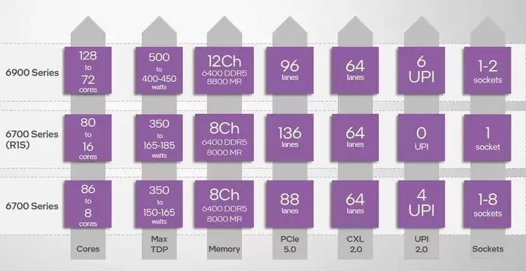 至强6900P是英特尔专为计算密集型工作负载设计的处理器,也是Granite Rapids的“完全体”。后缀的“P”意味其采用的是Performance Core,即性能核,规模大、性能强;6900的数字型号则说明其核心配置拉满——提供了72到128核的多种规格,TDP有400W和500W两种,组合成已公开5种型号,显得比较简洁。当然,依照惯例,云厂商等大客户还会有若干定制型号的。单就内核数量而言,6900P系列相对前两代“Rapids”产品线顶配的56/60(Sapphire Rapids)或64核(Emerald Rapids)直接翻倍!如此巨大的迭代幅度非常罕见,也难怪英特尔要改命名方式了,由表及里都透着一个意思:厚积薄发、脱胎换骨!