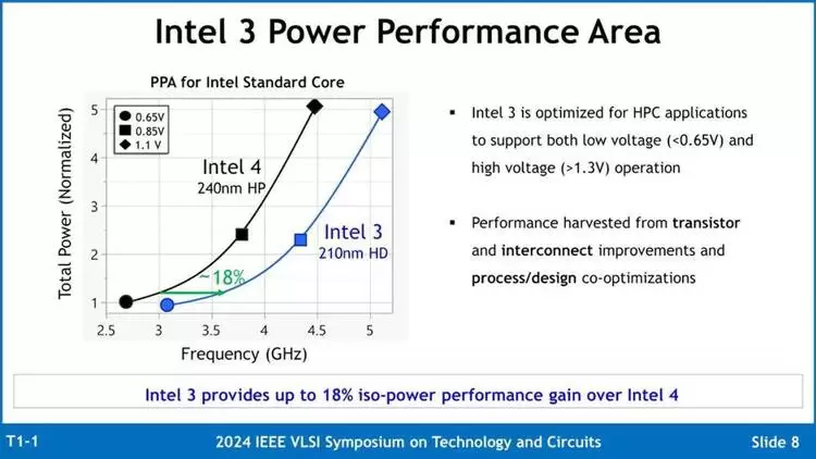 对于性能取向,Intel 3针对高性能运算进行优化,可以支持低电压(<0.65V)和高压(>1.3V)运行,且在各电压下的频率均高于Intel 4。