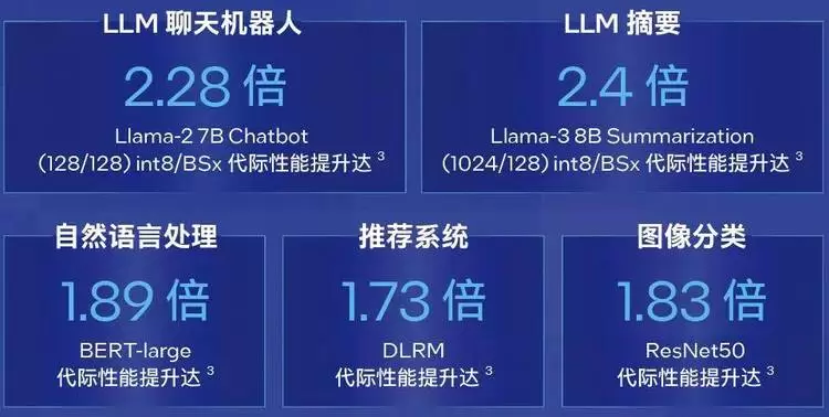 至强6900P的UPI2.0链路也有很大改进,速率提升到24GT/s,数量增加至6条,使得双路互联效率进一步提升。结合内核数量、内存带宽等方面的全面提升,至强6900P可以被视作高算力+高存力平台的最强机头,不论是科学计算,还是AI集群。根据已透露的测试,至强6900P平台的数据库、科学计算等关键应用负载的表现是上一代产品的2.31倍-2.5倍,AI应用性能是其1.83倍-2.4倍不等。