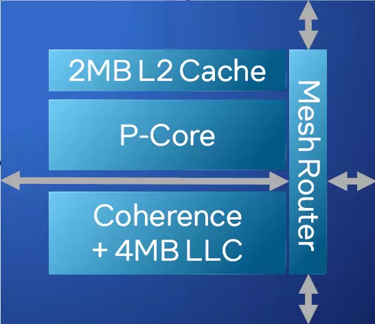 指令缓存从32KB增加到了16路、64KB;微操作队列从144个条目增加到192个条目;指令执行延迟降低;更智能的预取和改进的BPU;L2缓存的带宽有所提升;AMX增加FP16支持。当然,RedwoodCove还有一个重大的优势就是“命好”,也就是前面提到的EUV制造工艺。但即使有革命性的制造工艺加持,至强6性能核也没过分扩张每个内核的规模。就至强6性能核的内核而言,每个网格节点是一个P核,每个P核配置私有的2MB L2缓存,以及共享的4MB 末级缓存。虽然平均到每个核的缓存容量并不比上一代至强(Emerald Rapids)多,但胜在总核数翻倍后。至强6性能核每个处理器可共享的末级缓存总容量依旧达到504MB,远超第五代的320MB和第四代的112.5MB。