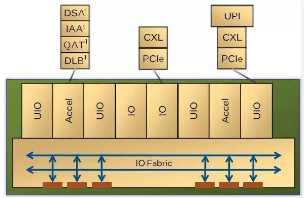 IO单元方面,至强6900、6700系列都使用2颗相同的IO芯片。每个IO芯片由2个IO模块、4个UIO模块、2个加速器模块,以及IO网络接口构成。每个IO模块提供x16 PCIe或CXL连接;每个UIO模块提供x24 UPI2.0,或复用为x16的PCIe或CXL;每个加速器模块提供DSA、IAA、QAT、DLB加速器各一个。
