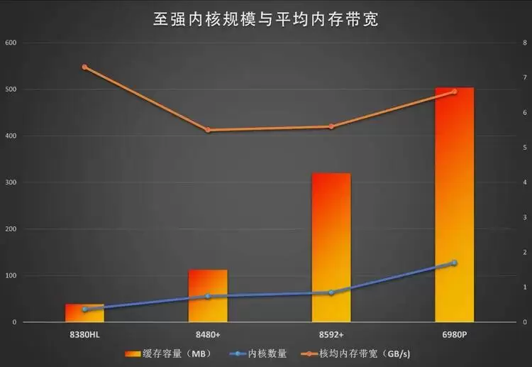 1.大容量末级缓存。前面提到过,6900P每个网格提供4MBL3,总容量达到了504MB,分别是四代的4.5倍、五代的1.6倍。而且,至强的全网格架构使得任意内核访问末级缓存的延迟相比其他厂商的一些产品有更优的表现,例如不需要跨计算单元而造成延迟剧增。这种架构效率更高的优势也是至强在核数曾落后的情况下还能打的有来有往的关键原因。