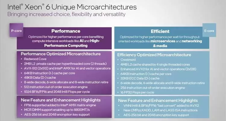 能效核的指令缓存与性能核都是64KB,但数据缓存分别是32KB和48KB。前端的指令解码器宽度也有差异,分别为6和8宽。指令乱序执行引擎差异较大,能效核是256条而性能核是512条。能效核不支持性能核所支持的AVX-512和AMX,这也可以明显减小矢量运算单元的晶体管占用,但代价是每周期的单精度浮点运算次数有了数量级的差异。但能效核也改进了AVX2,增加了VNNI的INT8和BF16/FP16快速转换,这样在处理AI应用的时候表现也还有所改善。另外,其256位加密和1024/2048密钥也获得了能效核的支持,确保至强6平台的安全水平基本一致。