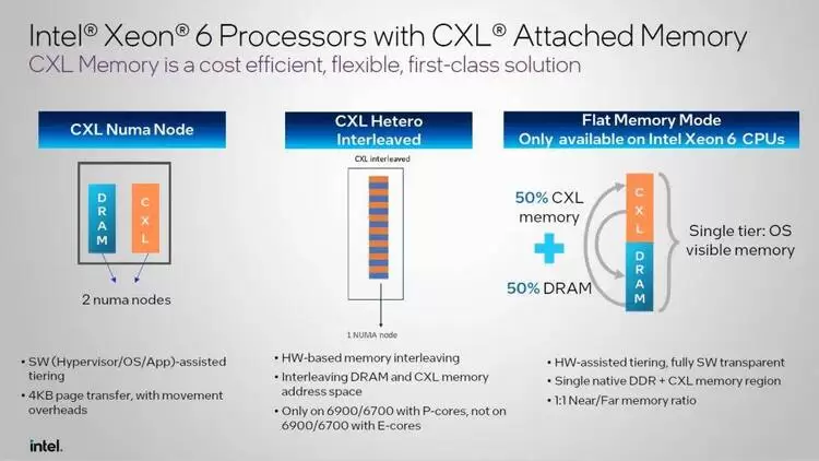 这里重点说一下CXL内存的优势。CXL2.0支持链路分叉,使一个主机端口可以对接多个设备,而且提供更强的CXL内存分层支持,可实现容量和带宽扩展。至强6支持3种CXL内存扩展模式:CXL Numa Node、CXL Hetero Interleaved、Flat Memory。