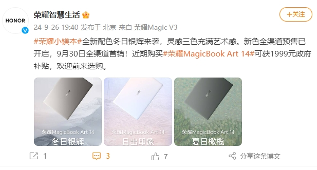 更具商务风的荣耀小镁本来了。在百年IFA展上惊艳亮相后,荣耀MagicBook Art 14冬日银辉新配色将于9月30日在国内开启首销,购买可享受国家以旧换新补贴20%优惠,到手价6799元起。