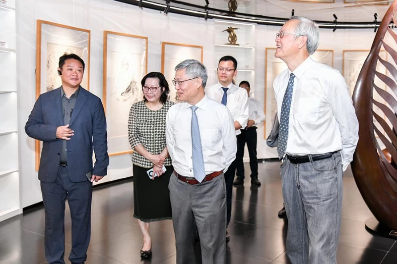 仪式上,广州商学院执行董事长郭小聪先生,张宇燕会长,国家级人才称号获得者、名誉校长李晓教授等10位参会领导嘉宾共同为图书馆揭幕。随着手中的启动键按下、启动球亮起、启幕门打开,盛装焕新的图书馆徐徐映入眼帘。与会领导嘉宾和学生代表在讲解员的带领下参观了改造升级后的图书馆,沉浸式感受焕然一新的阅读空间、学习环境和别致设计。