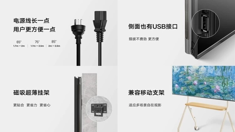 而这种用户主义思想,也被贯彻在AI TV的诸多细节之中。比如为避免插头离插口太远,长虹采用了2米超长电源线,解决了电源线的长度焦虑;智慧launcher设计直观简洁,只为让老人、孩子用着简单;机身侧面设置的USB接口,使外源设备连接时能更好插线;可兼容移动支架配有多种安装方式,也方便了多场景下的观影娱乐。