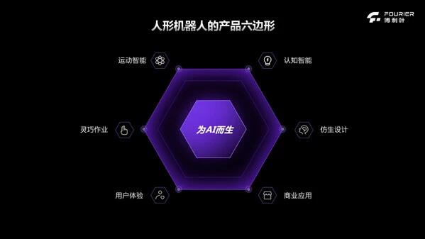 针对人形机器人本体的未来演进,傅利叶提出了"产品六边形"概念,围绕运动智能、灵巧作业、认知智能、仿生设计、用户体验和商业化应用共六个维度,明确机器人本体的能力标准和发展方向。