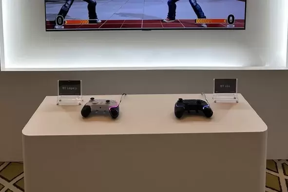 在周五的LG webOS峰会上,LG将支持BT ULL的控制器与标准控制器进行了对比。LG在新闻室发布的文章中表示:“演示突出了BT ULL技术在各种基于云的游戏(包括FPS、格斗和赛车游戏)中的优越响应速度、减少输入延迟和控制精度。”