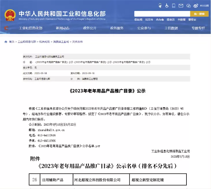日前,工业和信息化部公布了《2024年老年用品产品推广目录》,超视立渐变焦远近一体新型花镜成功入选,这是超视立旗下产品连续两年入选工信部老年用品产品推广目录。