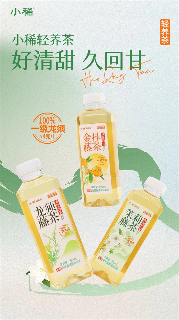 小稀无糖轻养茶是由中国藤茶产业领军品牌“小稀藤”旗下子公司——湖北小稀藤饮品有限公司重磅推出的,冠以“小稀”品牌的高品质饮品。根据当前茶饮行业发展趋势,小稀品牌与各高校合作,组织由植物学、营养学、食品工业等专家组成的研发团队,凭借深厚的专业知识与前沿的科研技术,不断挖掘藤茶的自然属性,攻克藤茶饮品的口味、营养成分、工艺、存贮等技术难关。开创性重磅推出比其它无糖茶更好喝、更健康的藤茶饮品——小稀无糖轻养茶。既保留了来凤藤茶天然营养价值,又满足当前消费者对健康轻养生的需求。