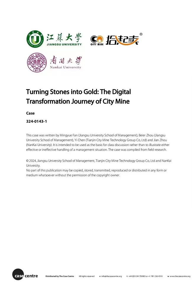 近日,由南开大学商学院周建教授、江苏大学管理学院樊茗玥副教授和拾起卖科技集团陈奕总裁联合撰写的教学案例《Turning Stones into Gold: The Digital Transformation Journey of City Mine》(即《点石成金:拾起卖的数字转型之旅》)入选全球著名管理案例库之一——欧洲案例中心案例库。