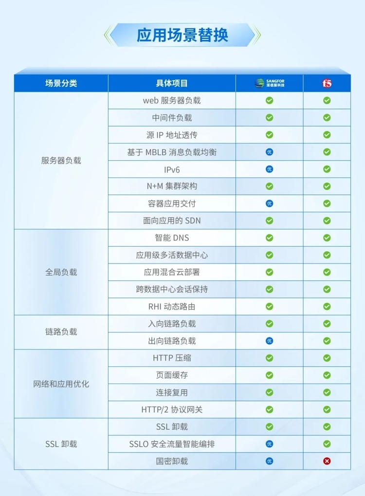 在传统应用交付领域(服务器、全局、链路负载)和新型云原生架构、SSLO安全流量智能编排等方面,实现能力的全面对标;在基于MBLB消息负载脚本执行效率、IPv6“天窗”改造智能处理、链路负载出向选路简单高效、容器应用交付生态多元化、国密卸载合规建设、SSLO安全流量智能编排运维方便快捷等20多个应用场景中,也都能实现全面替换,且表现优于F5。