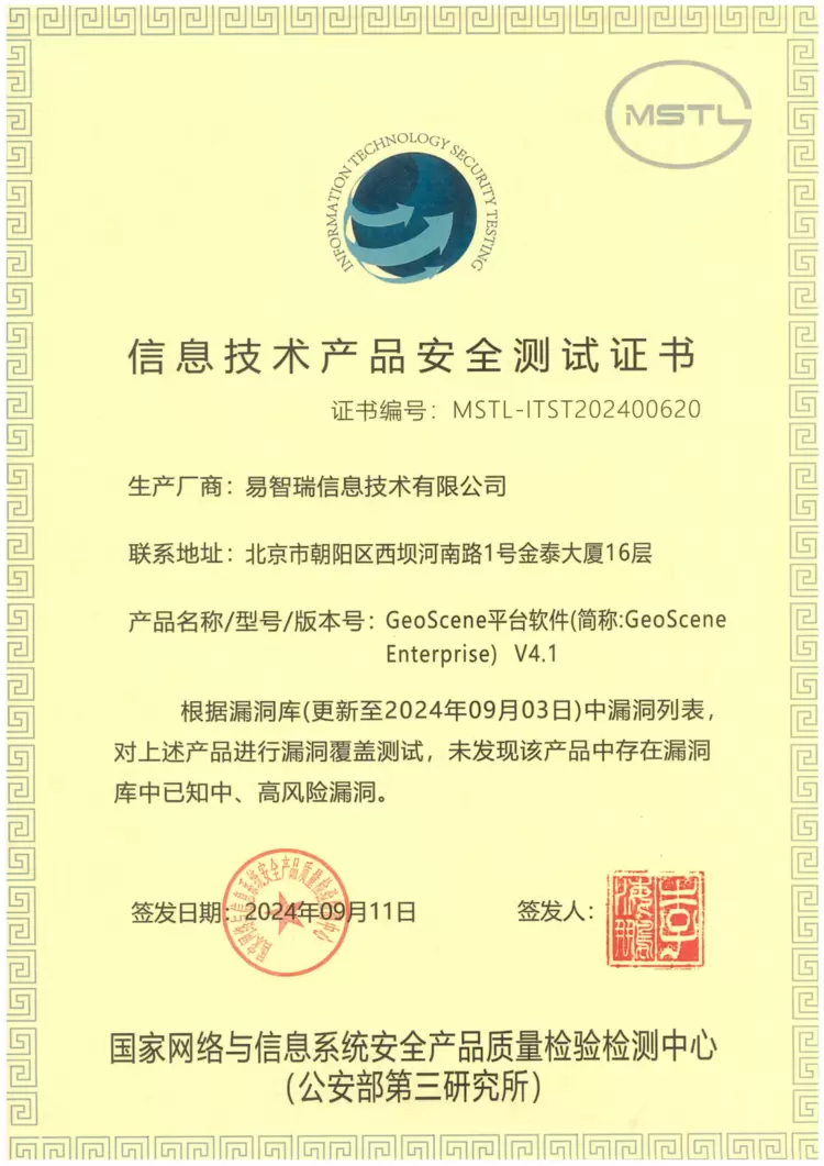 近期,由易智瑞公司自主研发的GeoScene平台软件(GeoScene Enterprise)V4.1经过层层严格检测,通过了国家网络与信息系统安全产品质量检验检测中心(公安部第三研究所)的安全测试,并获得了《信息技术产品安全测试证书》。