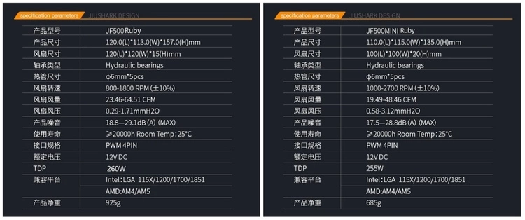 JF500Ruby/JF400D对比JF500mini Ruby/JF400mini,最主要差别就是散热器尺寸,mini系列为10CM尺寸的风扇,适合小机箱和散热需求不高的处理器。另外散热器还提供多种灯光版本可供选择。
