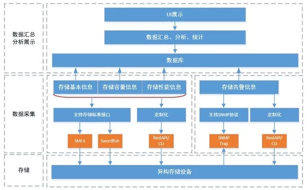 想要实现异构存储的集中监控,并不是一件容易的事。异构存储集中监控通过对存储设备信息、容量信息、性能数据、告警信息进行采集,经过分析和处理,通过多种告警通知途径,以可视化的管理方式实时通知管理维护人员。采集到的数据以图表和报告形式定期定时产生,并通知到存储管理人员、决策者以及相关业务人员。这基本上涵盖了异构存储统一监控系统的主要需求。异构存储监控平台的构建,其核心问题在于如何去采集不同品牌存储产品的信息数据,并且能统一数据格式。