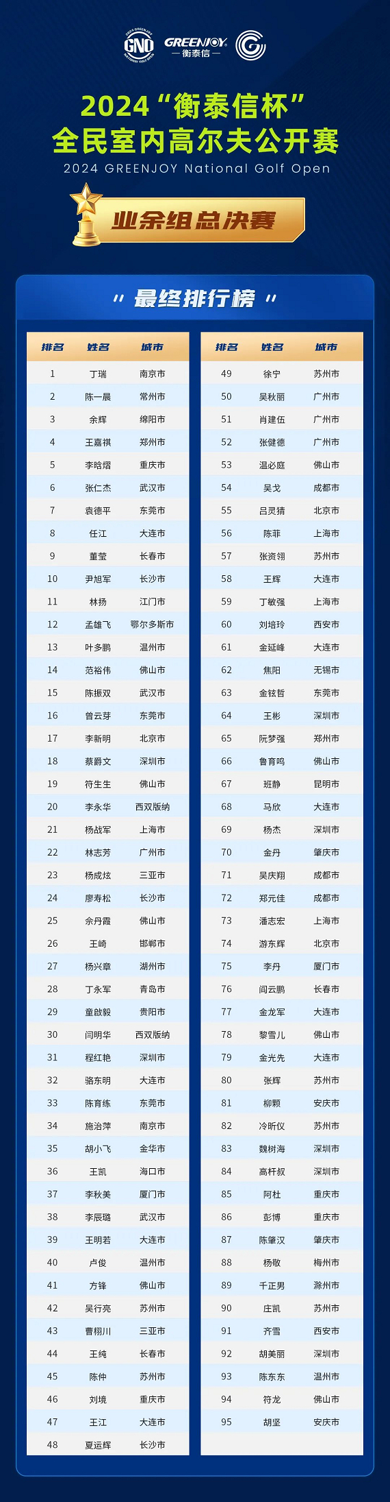 2024年9月26日,随着最后一杆的挥出,2024“衡泰信杯”全民室内高尔夫公开赛-业余组决赛轮在一片欢呼声中圆满结束。经过层层选拔和激烈较量,100名决赛球员的脱颖而出不仅彰显了他们的实力,也为这场盛会增添了无数精彩瞬间。
