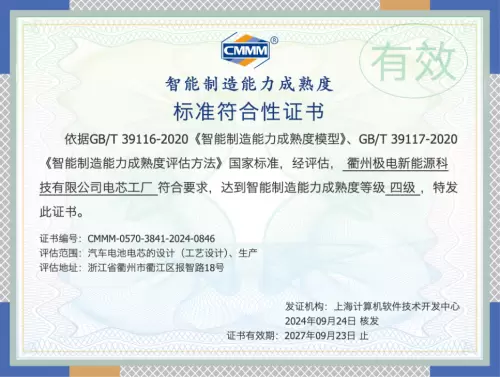 近日,国家《智能制造能力成熟度标准符合性证书》(CMMM)发布,由广域铭岛赋能打造的衢州极电制造基地高分荣获CMMM四级标准认证,成为浙江省首家四级成熟度工厂,也是全国电芯行业首家获此殊荣的工厂。