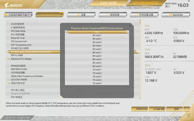 在新BIOS界面下,开启技嘉的一键式PBO功能整合能为锐龙9000带来负压提频效果,降低功耗同时提升性能。考虑到各个CPU体质不同,技嘉一键式PBO提供了90、80、70温度限制下level 1~5不同的共计15个档位,适用性非常广泛,即便不是昂贵的高端处理器型号也能放心使用。