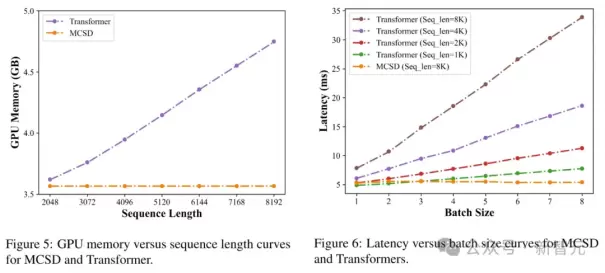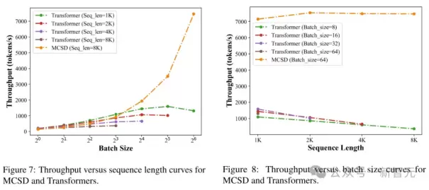 此外,有相同批大小或序列长度时,MCSD的吞吐量性能也远远好于Transformer架构。